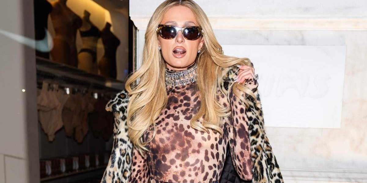Paris Hilton is wearing a leopard-print look that perfectly matches the sunny, tropical setting. She layers a sheer, flowy leopard-print cover-up over a matching bikini top, letting the fabric drape effortlessly while keeping the outfit light.