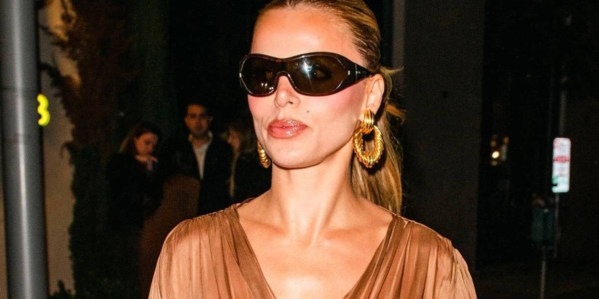 The skirt’s allure was accentuated by a gold chain-like pattern. Nader also opted for matching toe pumps, black sunglasses, gold hoop earrings, and a chic clutch. Her blonde hair was styled in a sleek ponytail, and her vibrant makeup, featuring peach lipstick, completed the look beautifully.