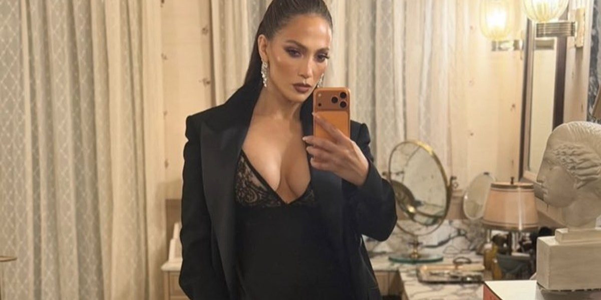 As shown in the photos above, the chest area of Lopez’s black slip dress features sheer mesh detailing adorned with floral patterns. She completed her look with a black blazer that enhanced the formal nature of her outfit while also providing contrast. The two-time Golden Globe nominee accessorized with a pair of diamond multi-teardrop earrings and a diamond-crusted ring featuring black detailing.