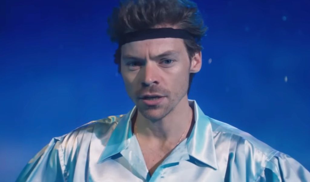 By the end, Styles has no choice but to “match their freak” before the scene cuts to him wearing a puffy, silky white shirt and black headband, proclaiming, “I’m about to go Lord of the Dance up in here.” Against a starry dark blue backdrop, he launches into an elaborate Irish-inspired routine, eventually joined by his friends on a foggy dancefloor.