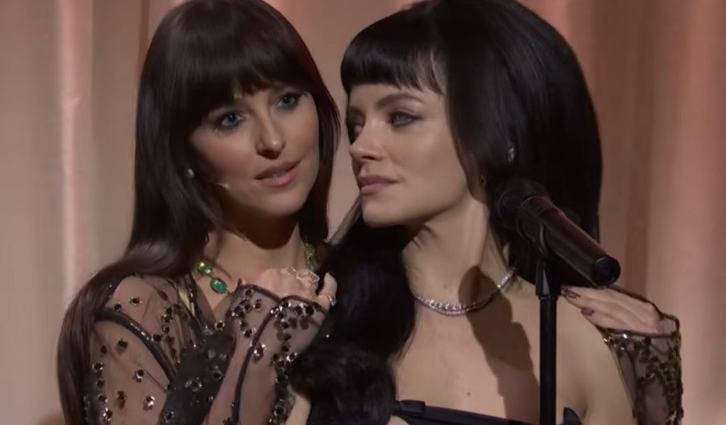 She followed with “Madeline,” performing in front of a translucent curtain that silhouetted a woman seated on a bed who’s having an extramarital relationship with her husband. At the end of the song’s spoken-word section, in which the woman reads a text message describing the affair, the figure stepped out and was revealed to be Dakota Johnson. The actress then stood behind Allen before kissing her on the cheek.