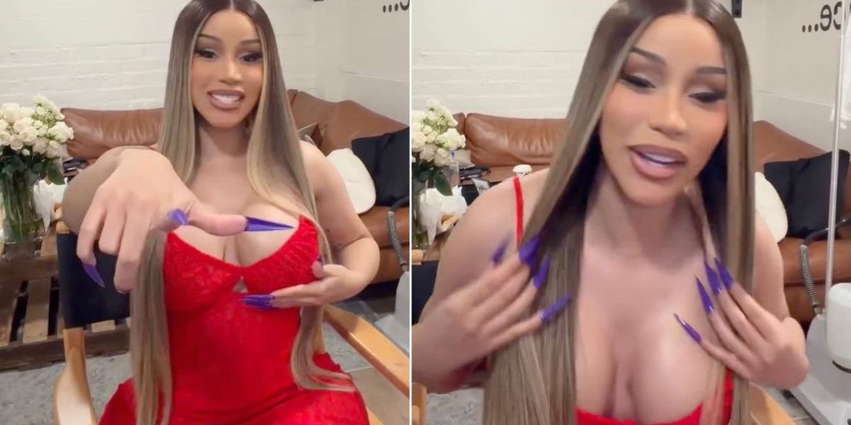 The video captured Cardi B wearing a bold, stringy red dress that hugged her curves. It featured a low neckline and spaghetti straps. She was singing the track “Salute” from her album “Am I the Drama?” punctuating the moment with hand gestures that drew attention to her long nails.