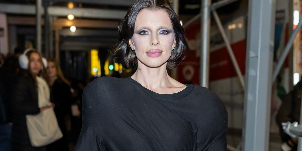Julia Fox doubled down on drama with a bold Aknvas bodysuit. The plunging neckline and high-cut silhouette created a sharp, sculpted look. She styled the piece without a bra and layered it under a statement faux fur coat, which she let slide off her shoulders for added impact.