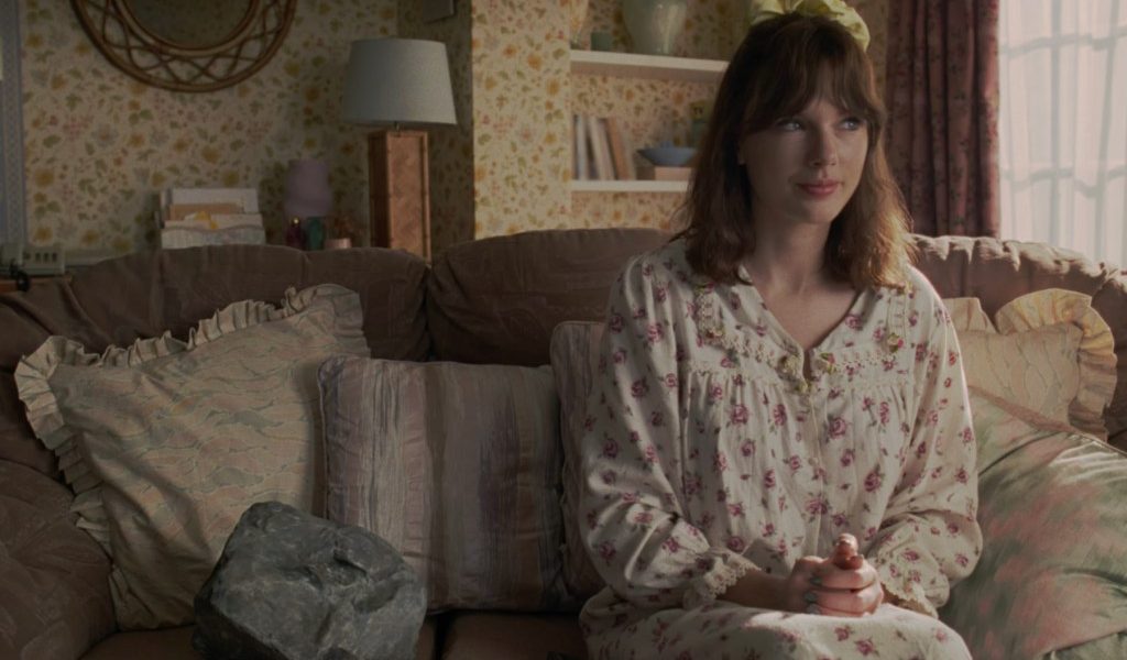 In one slide, a mirror selfie video taken on set, Swift jokes about feeling “so [herself]” and being ready to “go out there and slay another day” in her denim jeans, denim vest and multicolored striped shirt. Fans of the music video will recognize this outfit as the one she wears during an awkward couple’s photo shoot with actor Domhnall Gleeson, for which Scottish singer/songwriter Lewis Capaldi is the photographer.