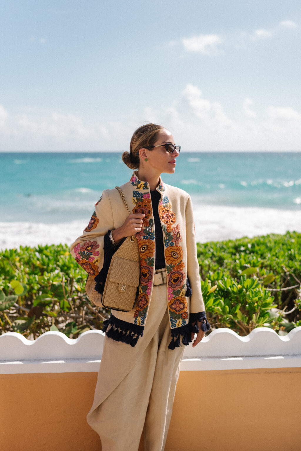 Valentino Jacket (similar here and here), Flore Flore Shirt, Ralph Lauren Pants, Marguax Sandals, Bottega Veneta Sunglasses, Chanel Bag, Irene Neuwirth Earrings (similar here)