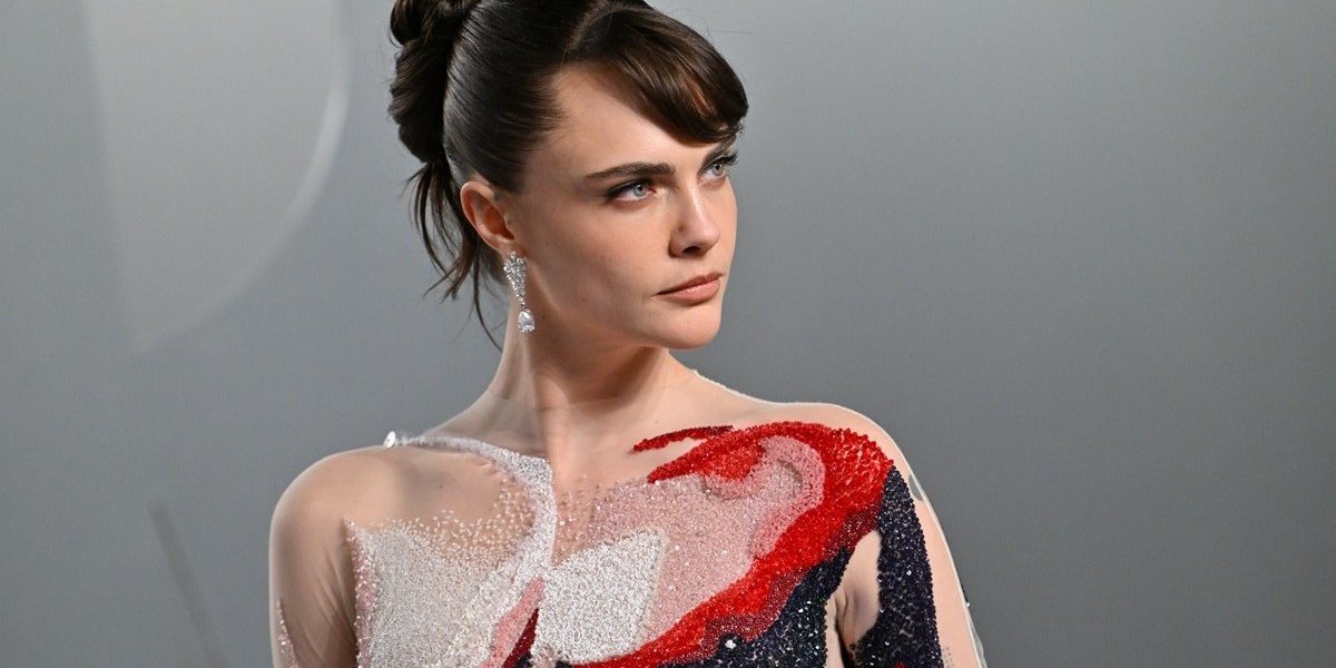 Delevingne wore a stunning gown from Thom Browne’s Spring 2026 collection. The sheer bodice features an abstract design of a human torso bedazzled with black, red, and white rhinestones as well as shimmering sequins. The bottom half of the gown is in sharp contrast to the striking top, featuring a simple black floor-length skirt.
